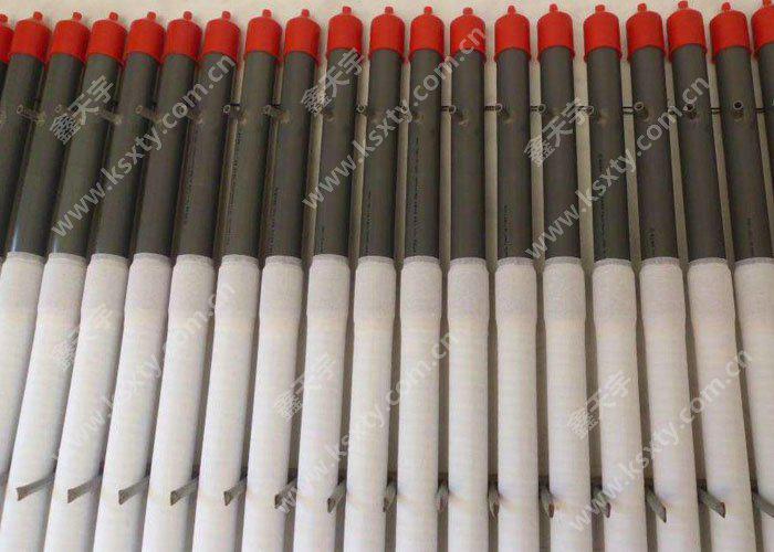 電泳陽(yáng)極管(TAS):又名電泳陽(yáng)極罩 、管式陽(yáng)極 。一般采用PVC和ABS管兩種材質(zhì)做內(nèi)支撐,在支撐管壁上裹上一層電泳涂裝專(zhuān)用離子陽(yáng)極膜或陰極膜,達(dá)到離子交換、去除酸根離子,達(dá)到穩(wěn)定槽液ph值等作用。陽(yáng)極為圓柱體結(jié)構(gòu),稱(chēng)為陽(yáng)極管,電極直徑為Φ48mm或51mm,推薦304或316的不銹鋼管厚度不低于3mm,陽(yáng)極膜外徑Φ 75mm, 根據(jù)槽體的深度不同,提供不同長(zhǎng)度的陽(yáng)極管。