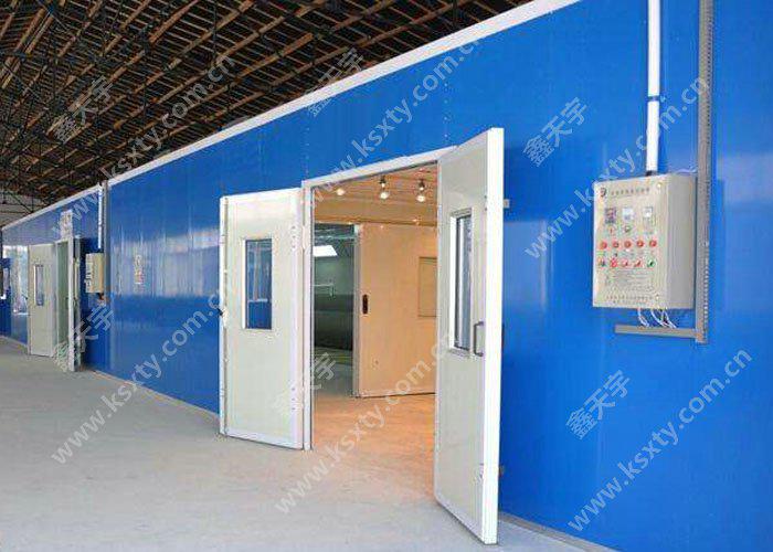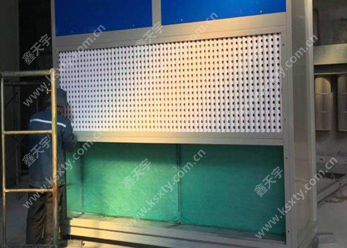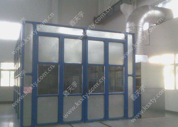 干式噴漆室主要由室體系統(tǒng)、新風(fēng)過(guò)濾系統(tǒng)、漆霧處理系統(tǒng)、排風(fēng)系統(tǒng)、照明系統(tǒng)、有機(jī)廢氣處理系統(tǒng)、廢氣檢測(cè)系統(tǒng)(可選配)、控制系統(tǒng)等部分組成。棚頂設(shè)進(jìn)風(fēng)過(guò)濾裝置,使進(jìn)入漆房的自然風(fēng)得到初凈化。在漆房的棚頂外側(cè)裝有防爆照明燈。漆霧過(guò)濾系統(tǒng)主要功能是過(guò)濾及吸附漆房中的漆霧與溶劑,確保排出室外的空氣質(zhì)量。排風(fēng)凈化裝置分兩段,前一段為漆霧過(guò)濾裝置,過(guò)濾廢漆;后一段采用活性炭吸附。